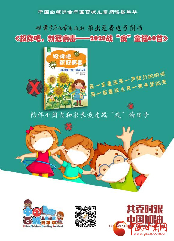 庚子之春,新冠肺炎疫情爆發(fā),全國人民奮力投身到這場疫情防控阻擊戰(zhàn)中,孩子們、兒童文學作家也紛紛創(chuàng)作了大量優(yōu)秀的童謠。2月份,讀者出版集團旗下甘肅少年兒童出版社(以下簡稱:甘肅少兒社)積極聯(lián)合“葫蘆文產(chǎn)”,策劃上線了免費數(shù)字出版物《投降吧,新冠病毒——2020戰(zhàn)“疫”童謠60首》。書中收錄60首優(yōu)秀童謠作品,對兒童進行防疫科普宣傳,以期提高兒童科學防護意識和戰(zhàn)勝病毒的信心。一首首童謠匯集起來,架起了孩子和家長共同抗疫的橋梁,也點亮了孩子們用稚嫩的眼光和思維認識這場災難的微光。