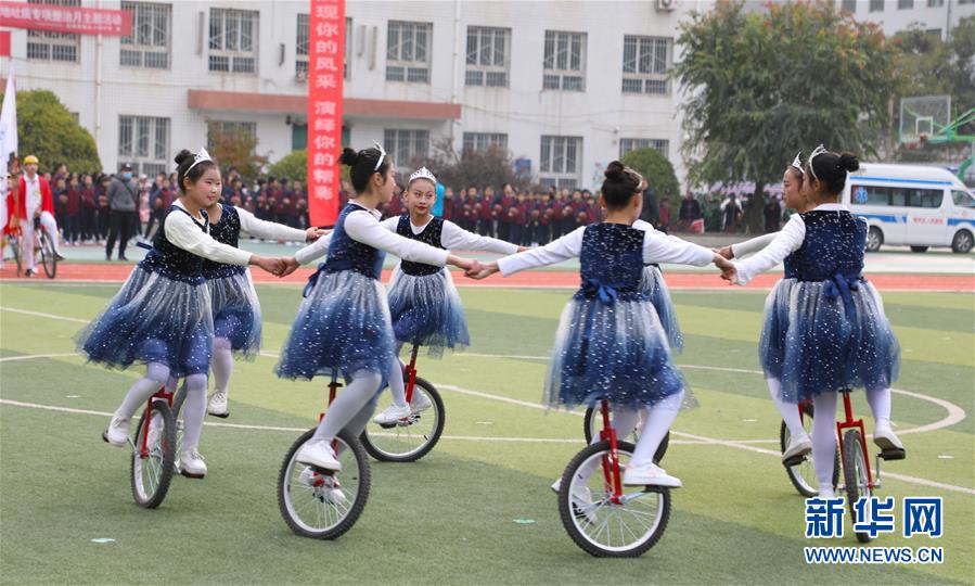 11月4日,蘭州市伏龍坪小學(xué)學(xué)生在活動現(xiàn)場進(jìn)行獨(dú)輪車表演。新華社記者 張智敏 攝