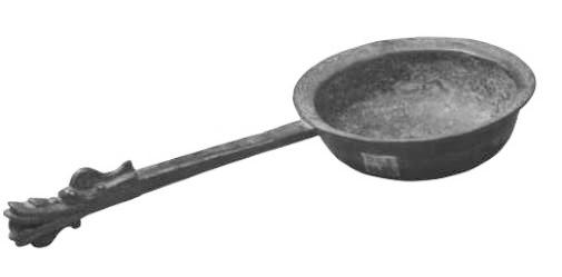 讓我們先看看這個(gè)熨斗:這是一件漢代家庭使用的生活工具,從外形來(lái)看,它通長(zhǎng)28厘米,柄長(zhǎng)16厘米,勺徑12厘米。柄、勺分別鑄造后焊接而成,勺圓口,寬折沿,微侈,圓腹,圓底,外沿下一圈弦邊。沿下焊柄,柄呈平面,圓底條狀,柄首呈張口龍頭形,勺內(nèi)有黑色炭跡。這是兩千年前漢代人使用時(shí)留下來(lái)的痕跡。在勺的外側(cè),還有一塊類似銘文的東西。
