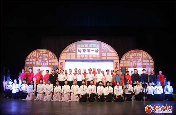 《隴原第一槍》全劇分希望、播火、誆宴、奪槍、功捷5場(chǎng),演出團(tuán)隊(duì)分為前臺(tái)演唱組、樂隊(duì)伴奏組、影人挑纖組、嘛簧幫唱組,演職人員中有國(guó)家級(jí)非遺代表性傳承人2人,省級(jí)非遺代表性傳承人2人,市級(jí)、縣級(jí)代表性傳承人近10人,加上隴東音樂學(xué)院學(xué)生共50人參與了演出。