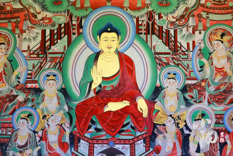 近日,一副長(zhǎng)15米、高6米的大型臨摹復(fù)制敦煌壁畫《無量壽經(jīng)變》在武威鳩摩羅什寺完美竣工,將于近期對(duì)外開放。