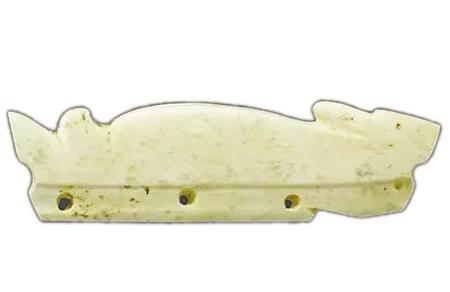 目前所見最早的玉兔有安徽含山凌家灘遺址出土的兔形飾件,其屬于凌家灘文化,距今5300年。該玉料受沁呈黃白色,飾件由兔形的上部和榫形的下部組成,兔呈伏臥狀,但無足部表現(xiàn),嘴前伸,耳朵向后伸,背部呈弧形上凸,尾巴既似兔子又若魚,上翹分叉;榫部長(zhǎng)條形,上面對(duì)鉆成四孔。