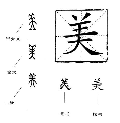 但是,從字源上看,“美”似乎不是一只羊,而是一個(gè)人。“美”初見于商代甲骨文,在甲骨文中,“美”不是會(huì)意字,而是象形字,它的古字形像一個(gè)戴著頭飾站得端端正正的人。一個(gè)人若頭上裝飾著高聳彎曲的羽毛或類似的頭飾物,是不是很美呢?本來遠(yuǎn)古時(shí)的先民喜歡在頭上插上橫七豎八的頭飾,再聯(lián)想一下印第安酋長頭上那頂裝飾著長長羽毛的發(fā)冠,“美”的甲骨文字形簡(jiǎn)直就是印第安酋長的簡(jiǎn)筆畫。