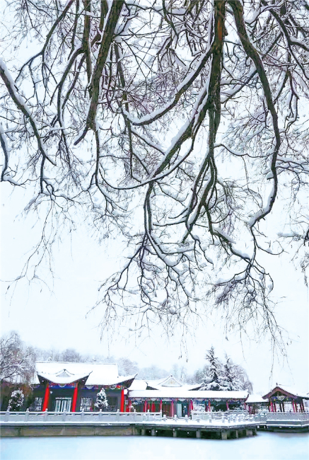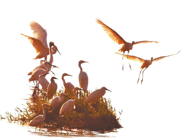 去年12月底,一位老師來西峰講學(xué),我陪先生到濕地海綿公園轉(zhuǎn)悠,剛剛步入人行道,發(fā)現(xiàn)遠(yuǎn)處湖水中央有七八只白鷺在棲息,朝陽斜射到湖面上,水波瀲滟,像細(xì)碎的金斑,白鷺安詳?shù)叵礈熘鹈幸恢话槅瓮戎绷⒅?,恰似依著一根筆直纖細(xì)的鐵絲,半張著翅膀,欲飛不飛的樣子,剩下的幾只白鷺在戲水,迷人極了。