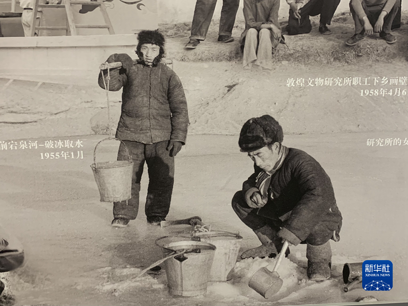 展覽的第二部分,主要呈現(xiàn)1944年“國立敦煌藝術(shù)研究所”成立后,幾代文化工作者扎根大漠、開拓進取的歷程。該部分展出了大量老照片,如上世紀(jì)五六十年代,文化工作者破冰取水、耕作勞動的場景。