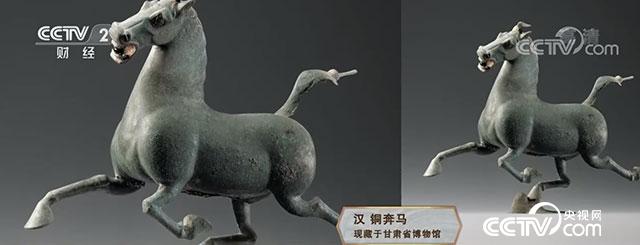 我整器由馬與飛鳥構(gòu)成,一匹正在急速飛奔的駿馬,身高34.5厘米,身長45厘米,全身呈流線型,肌肉健碩有力。馬的三足騰躍在空中,一足踏上飛鳥。飛鳥不知后面追上來的是什么,驚回首的一剎那間,馬已經(jīng)超在了前面,這馬踏飛燕(馬超龍雀)夢幻般的瞬間被定格成為永恒。