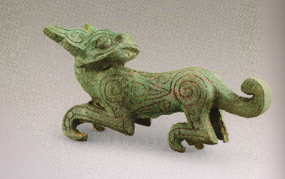 禮縣大堡子山祭祀樂器坑出土,共三只,造型相同,大小相似,為全國虎伴樂器出土的首例。其形象回首卷尾、聳耳曲爪、憨態(tài)可掬,極具觀賞性,是春秋時期虎造型的杰作,體現(xiàn)了秦國早期高超的造型能力和精湛的鑄造技術(shù)?;⒌男蜗笤诖呵锴厝说钠魑镏卸嘁姡坏凶猿蓚€體的金虎、青銅回首虎,同時虎作為附飾也出現(xiàn)在一些大的青銅器上。
