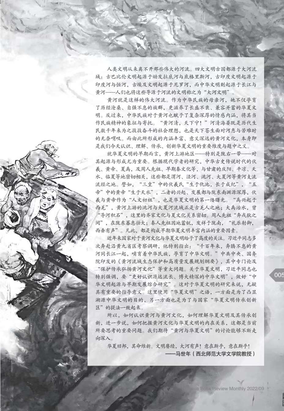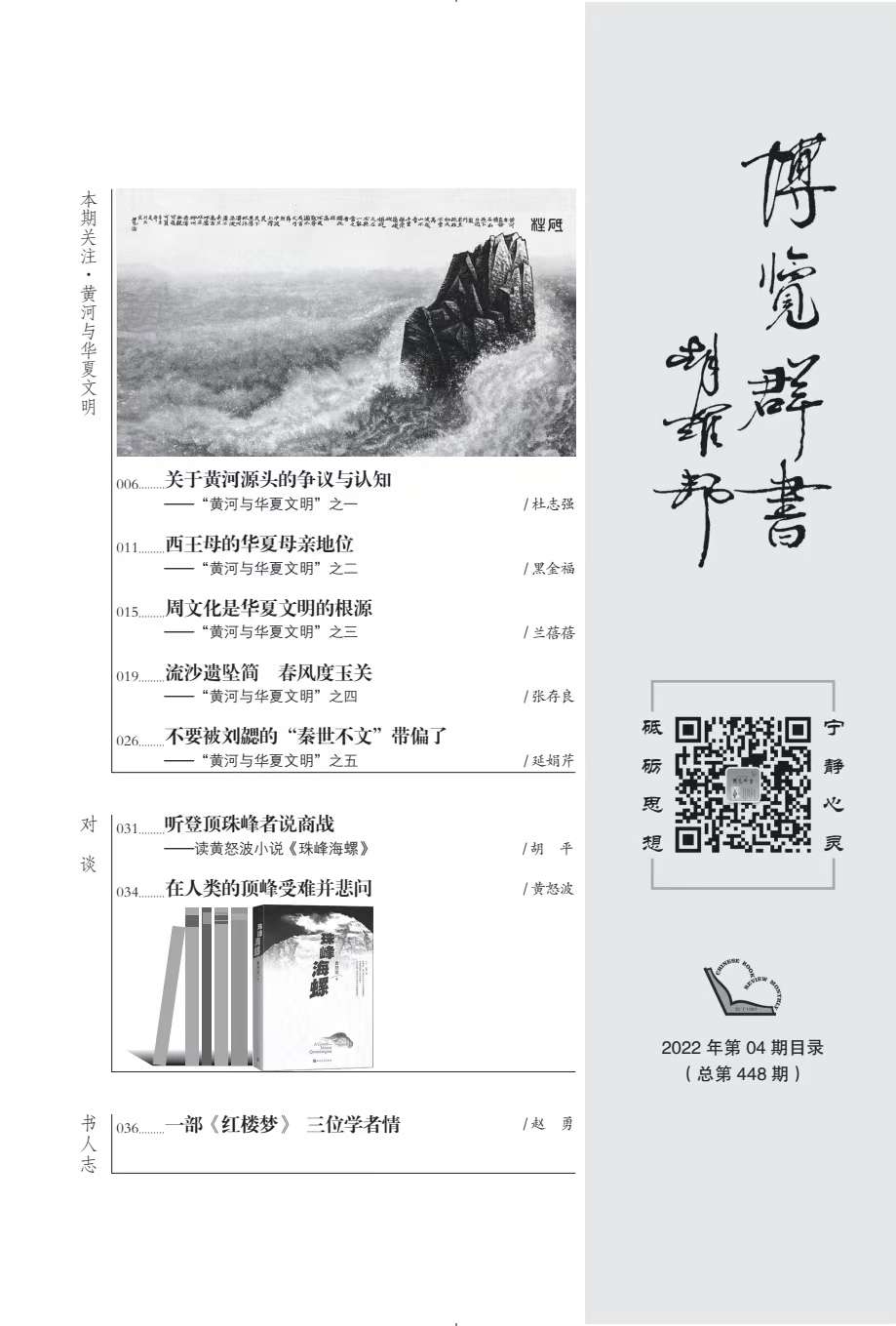 “黃河與華夏文明”系列文章(共9篇),由《博覽群書》編輯部邀約西北師范大學(xué)文學(xué)院馬世年、杜志強(qiáng)等著名專家策劃、組稿,作者有馬世年、杜志強(qiáng)、張景平、延娟芹、張存良、黑金福、劉陽杰、蘭蓓蓓等,分別刊發(fā)于《博覽群書》2022年3期、9期。系列文章著眼黃河文化,呼應(yīng)中央關(guān)于研究黃河文化的號(hào)召,探討華夏文明在黃河流域的發(fā)展、發(fā)生與傳承、創(chuàng)新;同時(shí),欄目通過精準(zhǔn)立意、深入考證和生動(dòng)表達(dá),卓有成效地推介和普及了黃河文化,深化了國人對(duì)黃河文化的認(rèn)識(shí)。已經(jīng)探討的相關(guān)論題有:歷史上關(guān)于黃河起源的爭議,黃河文化的內(nèi)涵,先周文化,秦早期文化,民族文化,西王母文化,絲路文化等。據(jù)《博覽群書》雜志介紹,鑒于這一主題的人文價(jià)值和巨大影響,編輯部將和學(xué)界更加密切配合,加強(qiáng)相關(guān)欄目,講好學(xué)術(shù)故事,推動(dòng)黃河文化研究形成新局面和新氣象。