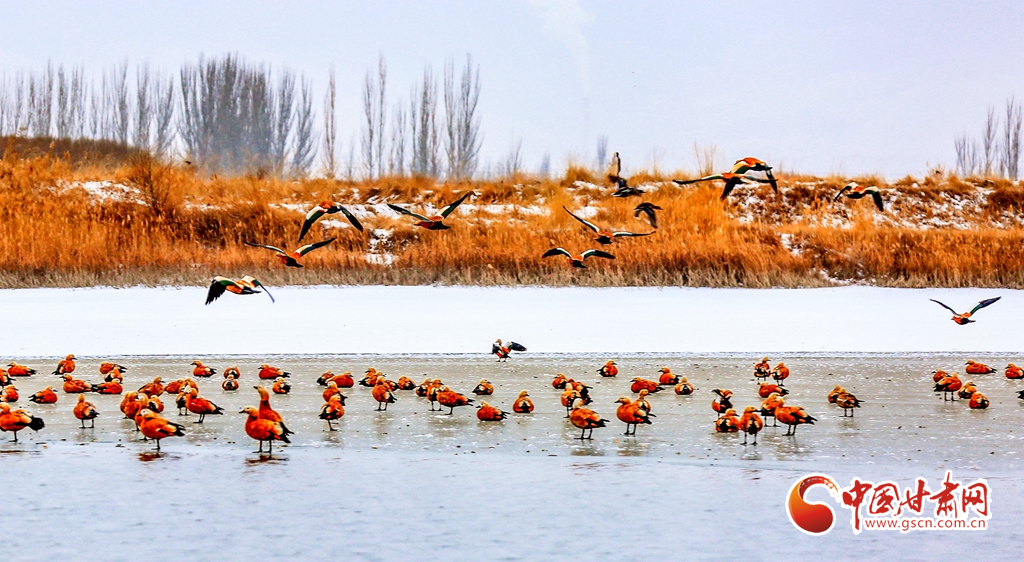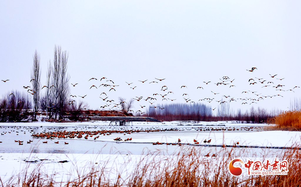 12月20日,在甘肅省酒泉市銀達(dá)鎮(zhèn)花園水庫(kù),一群候鳥(niǎo)正在戲水、覓食,為祁連山下的戈壁大地增添了一道亮麗的景色。