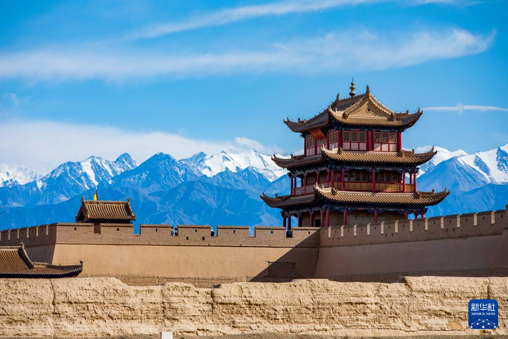 當日,位于甘肅河西走廊的嘉峪關(guān)市在一場疾風驟雨后,天空放晴,遠處祁連雪山與嘉峪關(guān)關(guān)城交相輝映,構(gòu)成一幅壯美畫卷。