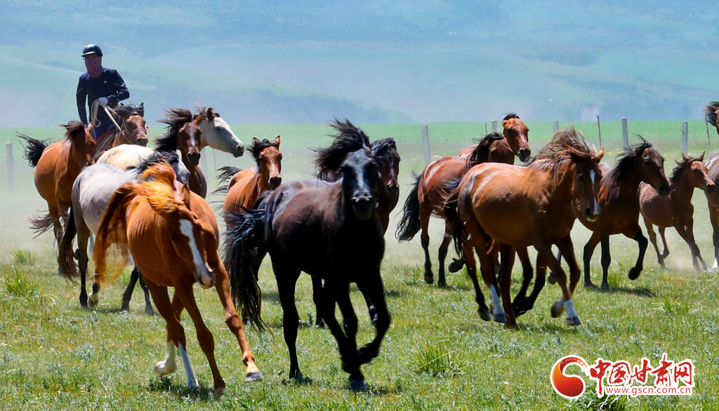 7月25日,位于祁連山北麓的甘肅省張掖市山丹馬場(chǎng)駿馬奔騰,吸引了眾多游客駐足觀賞。