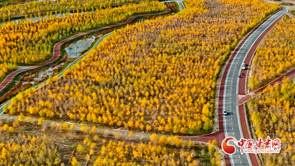 10月16日,甘肅省張掖奧林匹克森林公園萬畝人工胡楊林景區(qū)內(nèi),層林盡染、碧水環(huán)流,成為游客和市民欣賞美景和健魄身心的好去處。