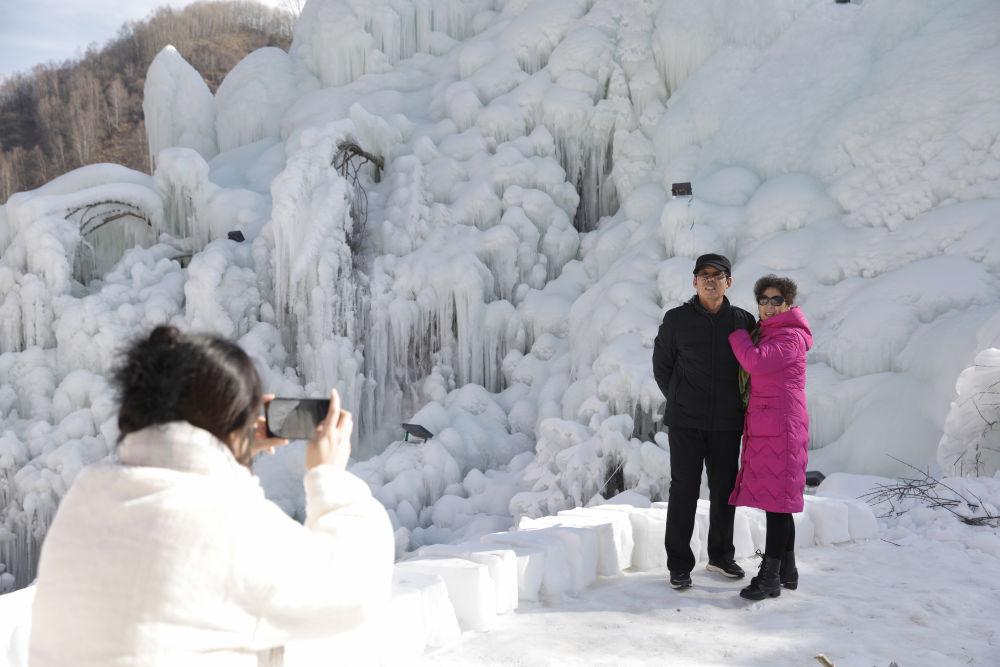 1月17日,在渭源縣天井峽西部雪谷,游客在拍照留念。新華社記者 方欣 攝