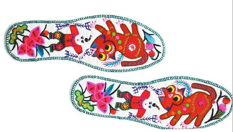 北方黃土高原,陜甘寧晉一帶,采用這種藝術(shù)縫制刺繡的衣物飾品有拼布藝術(shù)的鮮明特征,具有浮雕效果。其具體做法是將貼填繡畫相結(jié)合,有人叫做拼貼浮雕繡,在肚兜、枕頂?shù)鹊闹谱髦羞@種技藝采用最多。因?yàn)槎嗍钦w設(shè)計(jì),分部件制作,然后組合成一個(gè)完整的畫面在布上,所以叫“逗”,“逗”是秦隴方言,就是手指把不同部件小心拼合在一起組成圖案的動(dòng)作,因?yàn)椴计?,要小心仔?xì),輕輕拼合,所以會(huì)“逗裹兜”“逗夾襖”的媳婦,就是心靈手巧的人,說一個(gè)女性會(huì)“逗”,就是對她的女紅技藝的認(rèn)可。