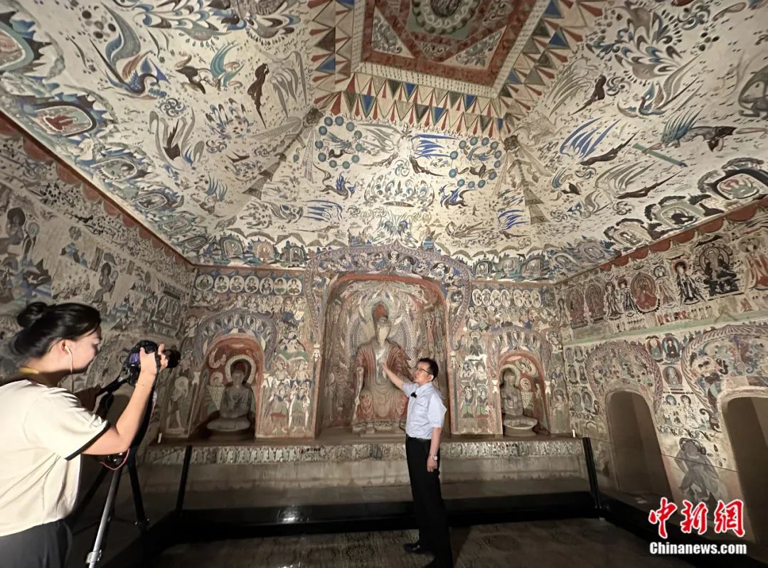 2023年7月,敦煌研究院副院長張元林在敦煌莫高窟第285窟原大復制窟內(nèi),接受中新社“東西問”獨家專訪。丁思 攝