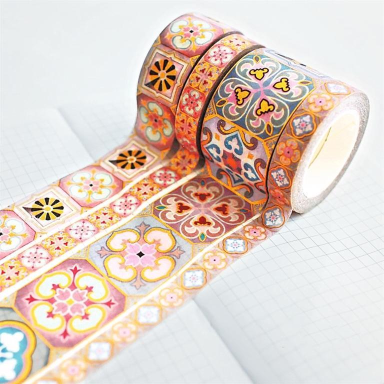 紋樣膠帶——在眾多文創(chuàng)產(chǎn)品中,膠帶的銷售或人氣排行榜靠前。紙膠帶雖是個小物件,但藝術(shù)化的紙膠帶卻能夠滿足多種需求,適應多層次人群的需求。圖形多來自器物上的印刻、繪制圖案,或抽象或具體。這也就體現(xiàn)了兩種效果,一種是文藝范,另一種是趣味感,來自重構(gòu)傳統(tǒng)的高大上,消解歷史的審美觀。設計靈感來自中國傳統(tǒng)紋樣,融合敦煌元素,有層次的色彩斑斕,圖案以及細節(jié)都恰到好處。