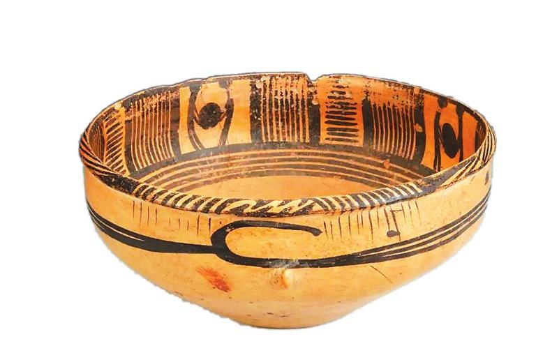 這件距今5000多年的古代彩陶作品,制作精致,圖案精美,人物形體鮮明,造型和動作既抽象又生動。彩陶盆通高11.3厘米,口徑24.5厘米,底徑9.8厘米,細(xì)泥制作,唇外侈,略鼓腹,腹部兩側(cè)有對稱的小鈕??谘貎?nèi)壁為四組雙人抬物圖案,中間以橫豎線條組成的幾何圖案間隔,形成一周四方連續(xù)的紋飾帶,繪制于陶盆內(nèi)側(cè)上部,二人的頭部以圓點代表,軀干和四肢以線條描繪。兩人相向站立,共同抬起一個碩大的圓形物體,畫面簡潔而生動,寥寥數(shù)筆就將人抬重物時雙腿開立、腰背微屈用力的形態(tài)刻畫得惟妙惟肖。陶盆上精妙的紋飾讓它成為我國最早在彩陶上表現(xiàn)原始先民勞作場景的藝術(shù)珍品。