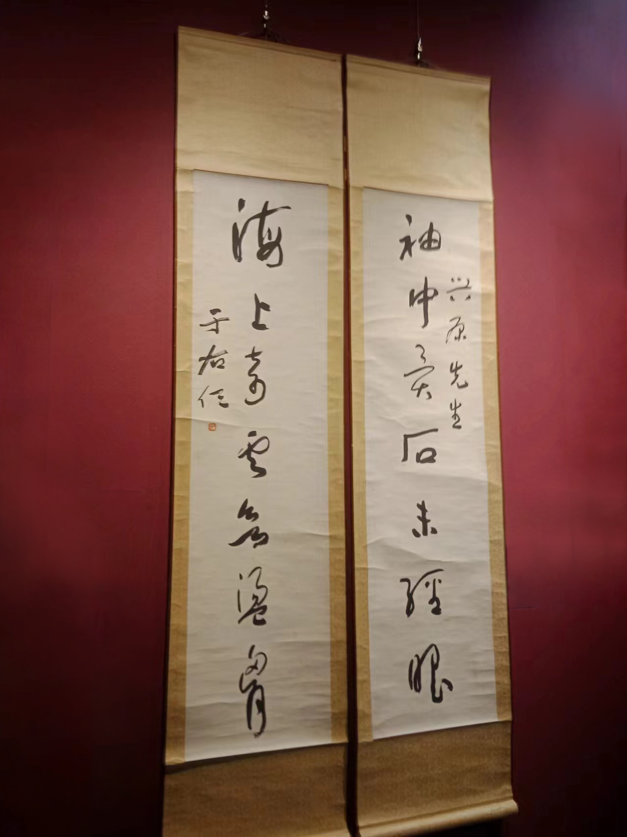 這次展出的于右任先生書法十余幅,有草書、行書和楷書。草書古詩“蜀本九經(jīng)最先出,后來孳乳到長興。蒲津毋氏家錢造,海內(nèi)通行價倍增(此幅落款‘五十一年’,應(yīng)是1962年先生去世前的作品)”,行書七言聯(lián)“袖中異石未經(jīng)眼,海上奇云未蕩胸”,楷書七言聯(lián)“萬卷藏書宜子弟,十年種木長風煙”等,書藝嫻熟,各有特色。所展墨寶筆法老練,墨氣逼人,筆者懷著崇敬的心情駐足敬賞,猶如與先生會面,久久不忍離去。