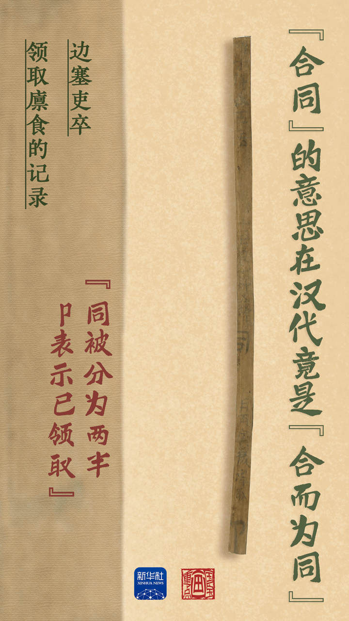漢代人在簡(jiǎn)牘上書(shū)寫(xiě)一個(gè)“同”字,從中間一分為二,由雙方當(dāng)事人各執(zhí)一半。需要核驗(yàn)時(shí),雙方將所執(zhí)半簡(jiǎn)合在一起,這樣就能拼成一個(gè)完整的“同”字?;蛟S,這就是現(xiàn)代“合同”的來(lái)歷。