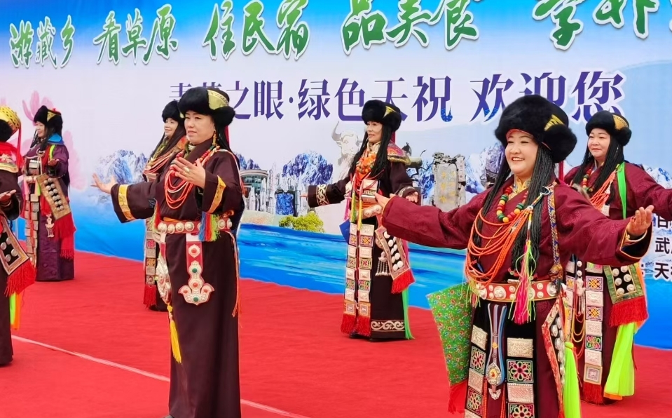 在天祝縣抓喜秀龍阿尼嘎卓帳篷城,身著藏族服飾的美麗卓瑪向采風(fēng)團(tuán)獻(xiàn)上了潔白的哈達(dá),華銳藏歌、華銳則柔、華銳鍋莊等獨(dú)具特色的文藝演出讓現(xiàn)場觀眾拍手稱贊。