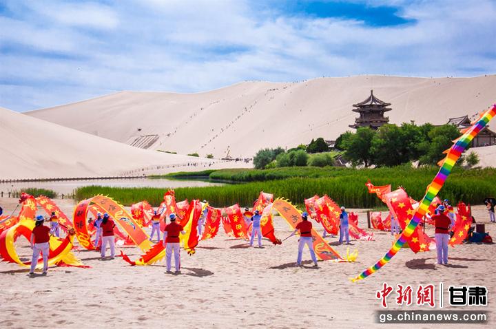 6月10日,敦煌市鳴沙山下,一場以敦煌市舞龍隊為首的20個健身舞蹈隊為廣大市民和游客獻上一臺臺精彩的舞蹈盛宴,吸引了眾多游客圍觀、拍照,在敦煌大漠度過一個難忘的端午節(jié)。王斌銀 攝