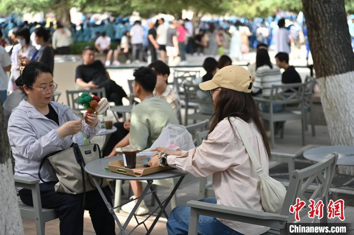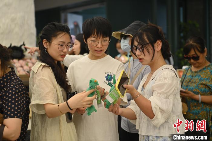 6月19日,甘肅省博物館藝術生活館在甘肅蘭州開館。該館是甘肅省博物館打造的一處復合型高價值文化空間,融合了咖啡、烘焙、展覽、藝術書店、文創(chuàng)銷售等多樣化業(yè)態(tài)。圖為游客相互交流挑選的綠馬玩偶掛件。中新社記者 李亞龍 攝