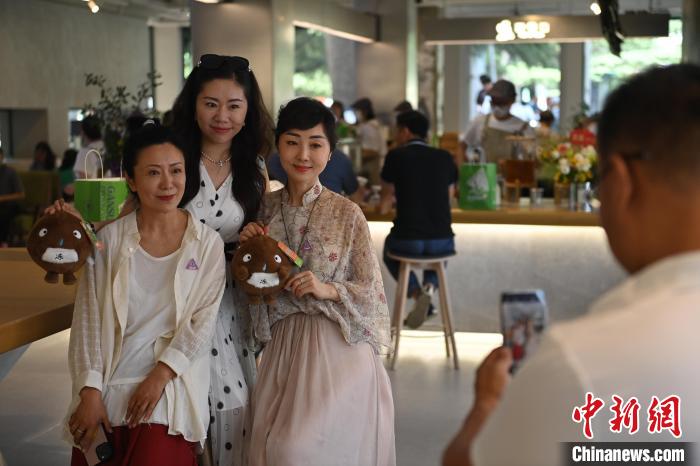 6月19日,甘肅省博物館藝術生活館在甘肅蘭州開館。該館是甘肅省博物館打造的一處復合型高價值文化空間,融合了咖啡、烘焙、展覽、藝術書店、文創(chuàng)銷售等多樣化業(yè)態(tài)。圖為顧客與自己挑選的蘭州凍梨文創(chuàng)玩偶合影。中新社記者 李亞龍 攝