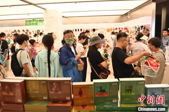 6月19日,甘肅省博物館藝術生活館在甘肅蘭州開館。該館是甘肅省博物館打造的一處復合型高價值文化空間,融合了咖啡、烘焙、展覽、藝術書店、文創(chuàng)銷售等多樣化業(yè)態(tài)。圖為游客挑選蘭州凍梨文創(chuàng)玩偶。中新社記者 李亞龍 攝