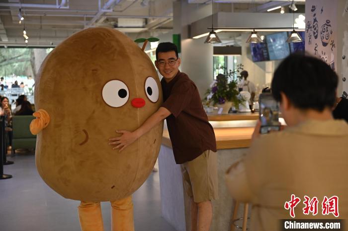 6月19日,甘肅省博物館藝術生活館在甘肅蘭州開館。該館是甘肅省博物館打造的一處復合型高價值文化空間,融合了咖啡、烘焙、展覽、藝術書店、文創(chuàng)銷售等多樣化業(yè)態(tài)。圖為顧客與蘭州凍梨文創(chuàng)真人玩偶合影。中新社記者 李亞龍 攝