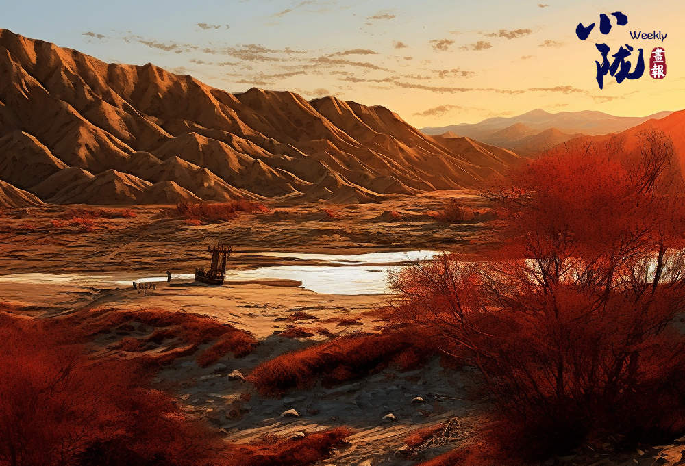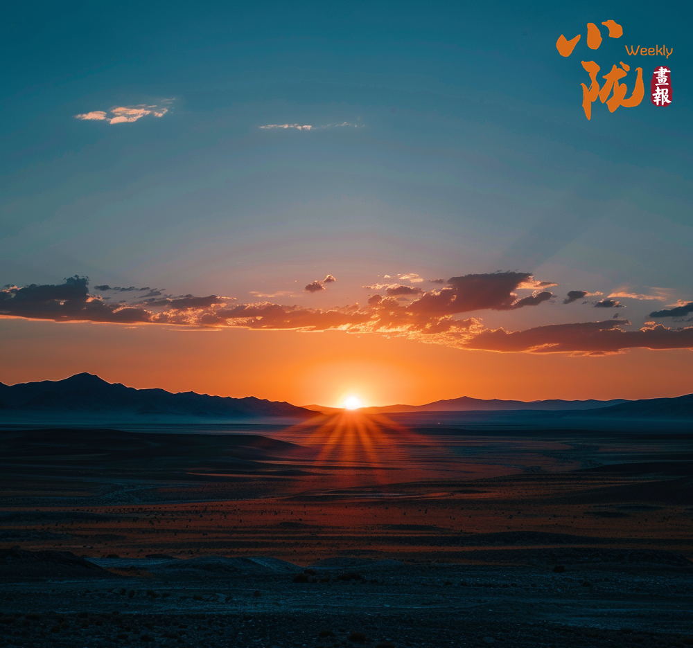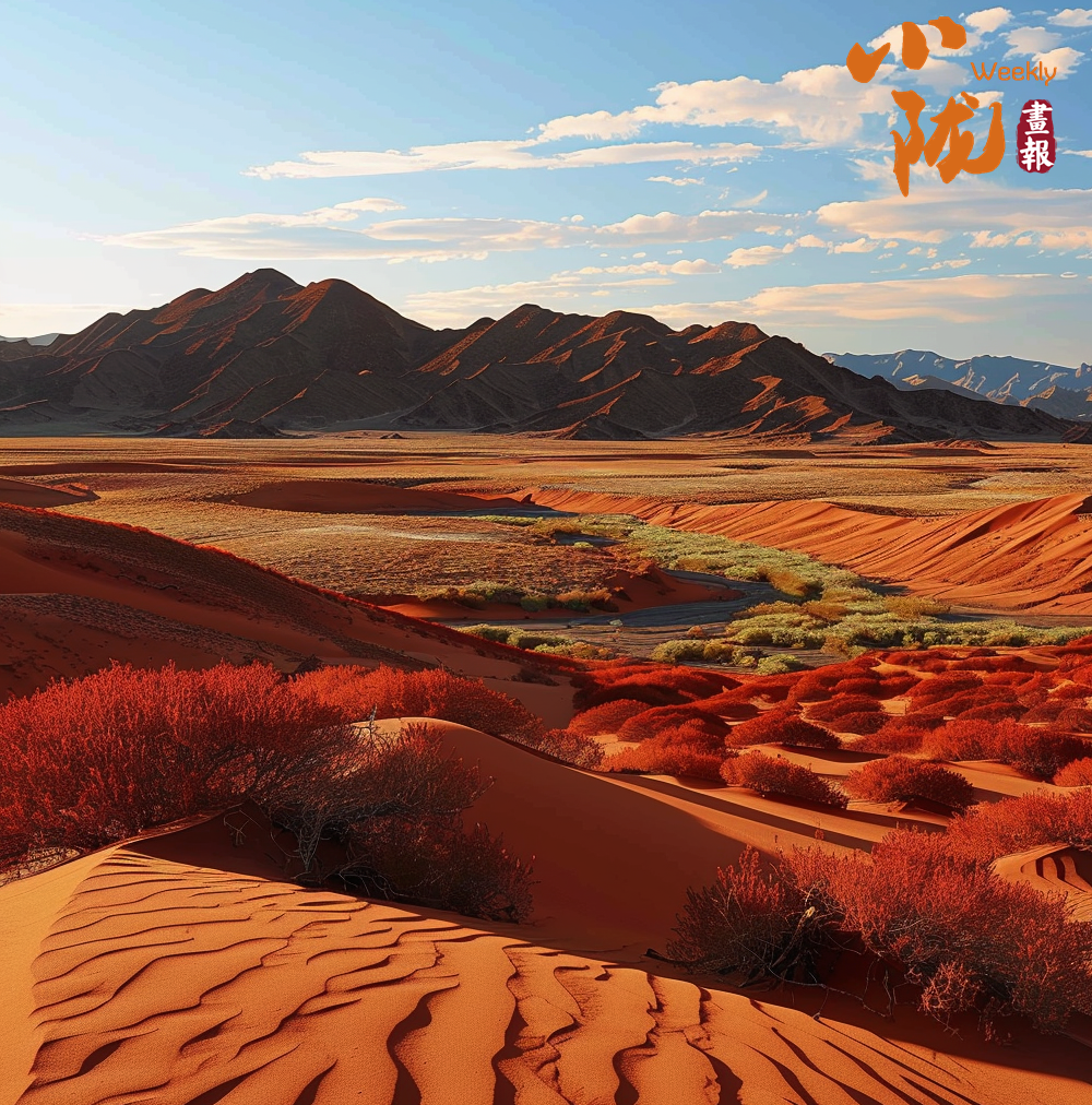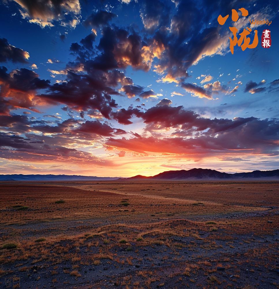 沙漠的沙粒在晚霞的映射下變得金黃而溫暖,仿佛覆蓋了一層光暈。遠(yuǎn)處的山峰也被晚霞點(diǎn)亮,宛如一座座火焰般迎接著夜晚的到來(lái)。