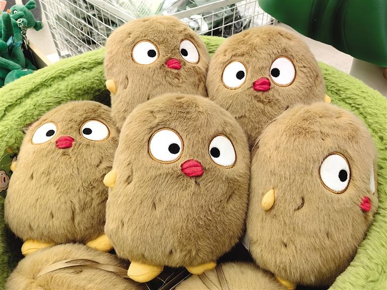 此時(shí),目不暇接的花式文創(chuàng)在店內(nèi)“爭(zhēng)奇斗艷”,爭(zhēng)當(dāng)“顯眼包”,等待被主人帶回家。掀開店內(nèi)一只毛絨收納箱,一窩土豆子撲閃著大眼睛向你眨眼。都說轉(zhuǎn)角遇到愛,誰料,轉(zhuǎn)角處粉嘟嘟的“拿捏玩偶娃娃公仔”捏著一個(gè)小蓮花花苞在向你招手。一回頭,造型別致的文創(chuàng)飾品精美又時(shí)尚,一側(cè)的帆布包上印著“別卷我”。就連記者逛下來,都入手兩件文創(chuàng)。
