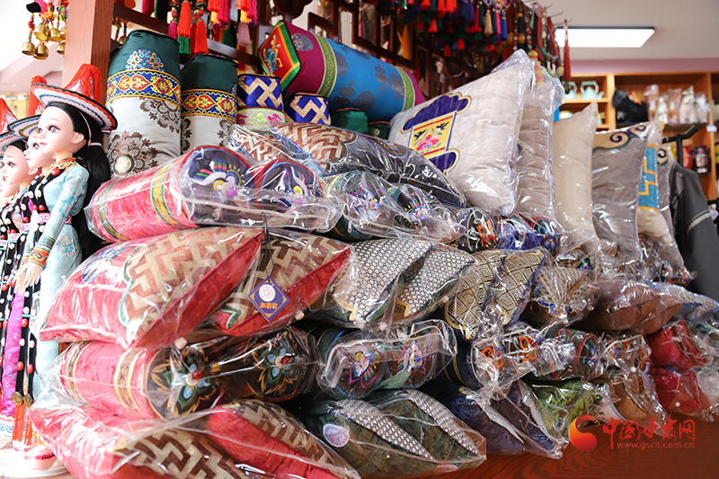 “這個抱枕上的設(shè)計非常別致,民族服裝領(lǐng)口和袖口的刺繡也很漂亮,引人注目、創(chuàng)意十足。”幾名挑選民族飾品和工藝品的游客們興高采烈地議論著。