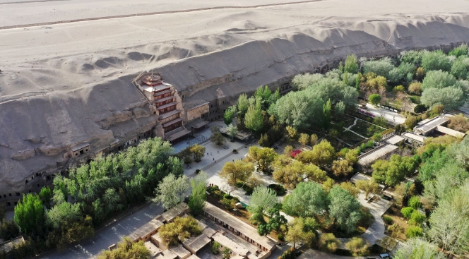 敦煌莫高窟窟區(qū)(無(wú)人機(jī)照片)。記者 陳斌 攝