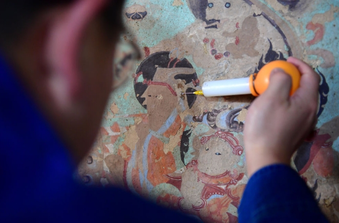 工作人員在修復(fù)出現(xiàn)病害的壁畫。記者 杜哲宇 攝