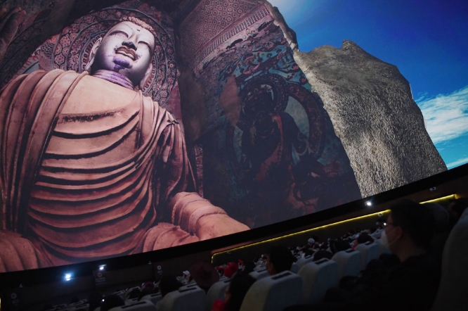游客在莫高窟數(shù)字展示中心觀看球幕電影《夢(mèng)幻佛宮》。記者 陳斌 攝