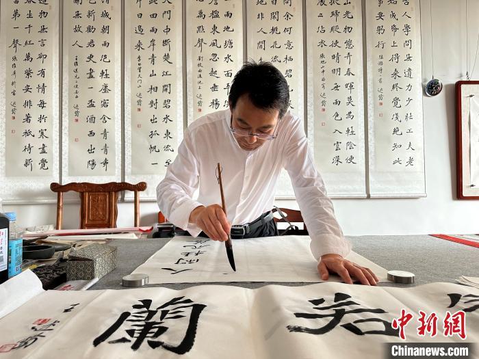 當(dāng)日,中新網(wǎng)記者跟隨通渭詩(shī)會(huì)采訪團(tuán)走進(jìn)通渭悅心國(guó)際書畫村。“我們這里重視寫字是刻在骨子里的,書法特長(zhǎng)班比重遠(yuǎn)高于音樂(lè)舞蹈等,而且從小學(xué)至高中每周有兩節(jié)書法課程。”工作人員冉盼盼說(shuō),由于祖輩傳承,書法在通渭不衰反盛,當(dāng)?shù)匾呀?jīng)形成了書畫裝裱、文房四寶銷售等完整產(chǎn)業(yè)鏈。
