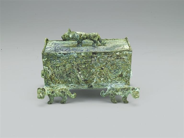 1993年山西省曲沃縣北趙村晉侯墓地62號(hào)墓出土。波曲紋虎足方盒為生活用具,出土于晉穆侯夫人墓。盒為長(zhǎng)方形,口徑略大于底徑,斜直壁,頂部有立體的虎形捉手,兩扇小蓋可以開(kāi)啟,盒下有四虎為四足,虎首朝外。盒四壁上部飾鱗紋,下部飾波曲紋。此盒設(shè)計(jì)精巧,器型較小,紋飾精美,應(yīng)是古代貴族女性用來(lái)珍藏小型物件的容器。