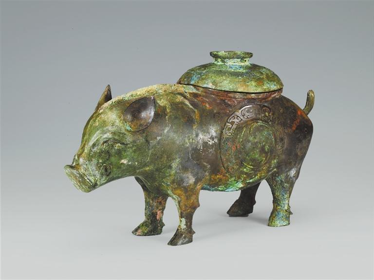 山西省曲沃縣北趙村晉侯墓地113號(hào)墓出土。豬尊出土于第一代晉侯燮父的夫人墓中。背上有蓋,蓋面飾云雷紋。器腹兩側(cè)各飾同心圓渦紋,周圍飾變形獸面紋。蓋內(nèi)及外底均有銘文:“晉侯乍(作)旅飤(sì)”。“飤”通“食”,多用于青銅食器上,而此尊應(yīng)是盛酒器,在酒器上自銘為飤,較為罕見(jiàn)。豬是伴隨著農(nóng)業(yè)文明的出現(xiàn)而成為最早飼養(yǎng)的動(dòng)物之一,先秦時(shí)期多用作祭祀活動(dòng)的祭牲。晉侯墓地出土的豬尊,將酒器青銅尊鑄成日常生活中豬的形象,造型逼真,憨態(tài)可掬,工藝精湛,充分體現(xiàn)了青銅工匠的聰明才智。