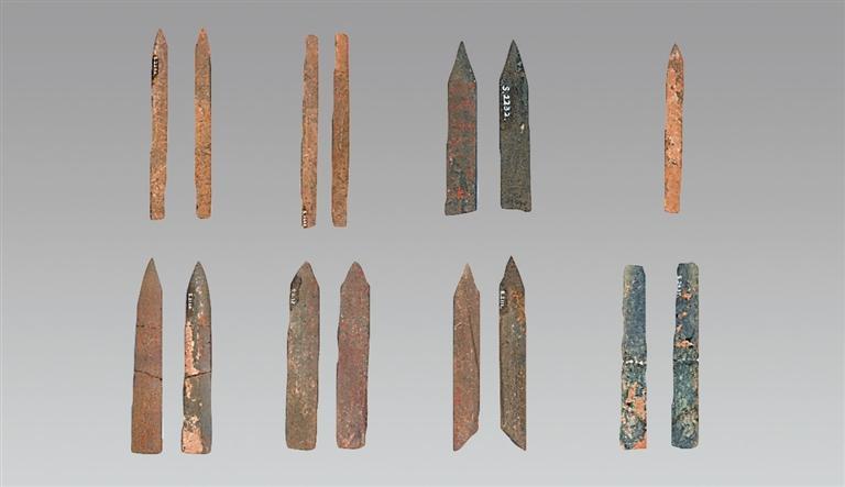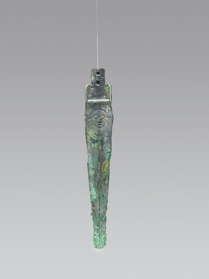 山西省絳縣橫水墓地出土。身呈長(zhǎng)條形,中部起脊,兩刃斜直,刃緣鋒利,劍身橫截面呈菱形。莖格部平面呈“凸”字形,有闌,側(cè)闌凸起,橫截面呈“工”字形,后端較窄,有兩個(gè)圓穿。劍身近莖格處兩面均飾陰線人面紋。雙合范鑄造。兩面人面紋頭頂上方鑄銘文:“楚公逆□□中戈。”考古人員推斷,有可能該件器物的作器者為楚公逆,與晉侯墓地M64出土的楚公逆編鐘、宋代嘉魚(yú)縣出土的楚公逆鐘的作器者為同一人。