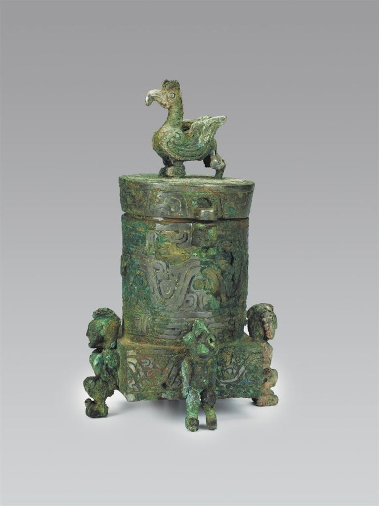 山西省曲沃縣北趙村晉侯墓地63號(hào)墓出土。圓筒形,帶蓋,蓋與器體以子母口套合,蓋平頂,上有圓雕立鳥(niǎo)形鈕,鳥(niǎo)彎喙,雙目圓睜,作展翅欲飛狀。器為平口,口沿有一對(duì)貫耳,直壁,方形底座,底座四壁各有一個(gè)人形足以承器體。人發(fā)髻高聳,赤身裸體,屈膝下蹲,作奮力抬舉器物狀,形象寫(xiě)實(shí)生動(dòng)。方座飾波曲紋,內(nèi)底有兩只小鈴,可發(fā)聲。蓋頂飾斜角云紋一周。蓋沿和口沿飾變形獸體紋,筒腹和方座飾波曲紋,筒下層飾鱗紋一周。這種形制的青銅器尚屬首見(jiàn),其功用還有待于深入研究,但它獨(dú)特的藝術(shù)造型和裝飾卻可以說(shuō)是集眾器之長(zhǎng),獨(dú)步天下。