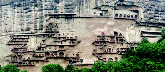 麥積山石窟與敦煌莫高窟、大同云岡石窟、洛陽龍門石窟齊名,是中國四大石窟之一,被譽(yù)為“東方雕塑陳列館”。公元759年杜甫流寓天水,作《山寺》詩:“野寺殘僧少,山園細(xì)路高。麝香眠石竹,鸚鵡啄金桃。亂石通人過,懸崖置屋牢。上方重閣晚,百里見秋毫。”其自然景觀與人文景觀完美結(jié)合,是世界文化遺產(chǎn)、全國重點(diǎn)文物保護(hù)單位,也是中原北方地區(qū)最早的皇家石窟,洞窟內(nèi)還保存了中國最早的連環(huán)畫作品。