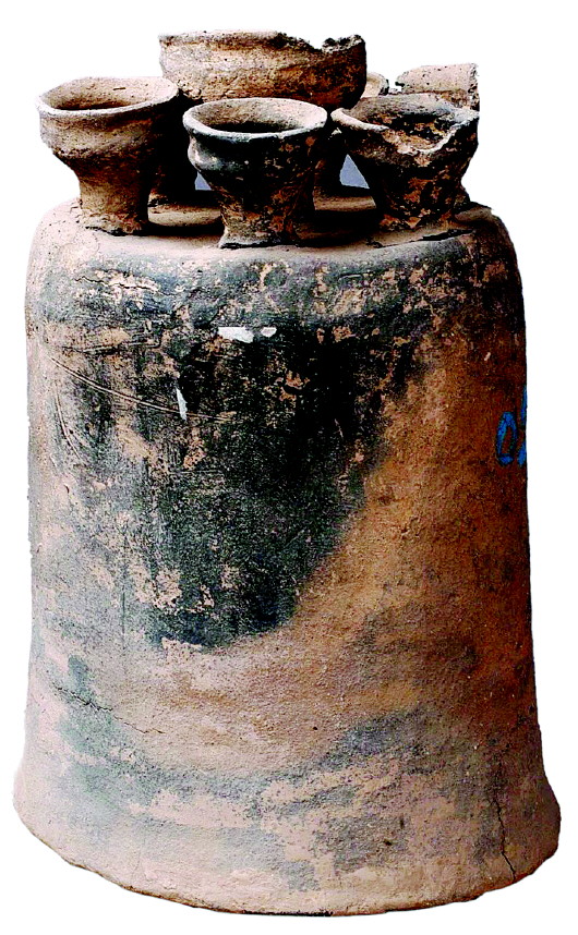 寺洼文化灰陶聯(lián)盞,通身為泥質灰陶,主體呈一倒扣的鐘形,在鐘形體的頂端粘連著七個豆狀盞杯。其中中間一個稍大略高,其他六個稍小一些,等距分布在中央一個的周圍,呈眾星拱月之狀。