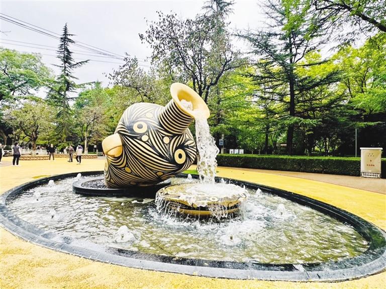 走進(jìn)公園(東口),入口處以“大河厚土孕彩陶”為主題的彩陶墻格外顯眼,墻上鑲嵌著不同造型和樣式的彩陶,分別介紹了大地灣文化彩陶、仰韶文化彩陶、馬家窯文化彩陶、齊家文化彩陶四個(gè)不同歷史發(fā)展時(shí)期。沿健身步道向西行進(jìn),體量巨大的馬家窯旋紋彩陶尖底瓶正向旋紋彩陶盆內(nèi)倒入“黃河之水”,這一景觀便是“彩陶流水”節(jié)點(diǎn),景觀造型采用跌水、涌泉的形式,打造出彩陶流水的動(dòng)態(tài)效果,象征著黃河文化的源遠(yuǎn)流長。