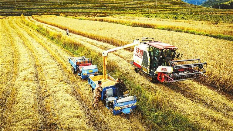 天??h朵什鎮(zhèn)萬畝梯田,農(nóng)機(jī)手駕駛收割機(jī)收割小麥。新甘肅·甘肅日報(bào)通訊員 趙世鵬
