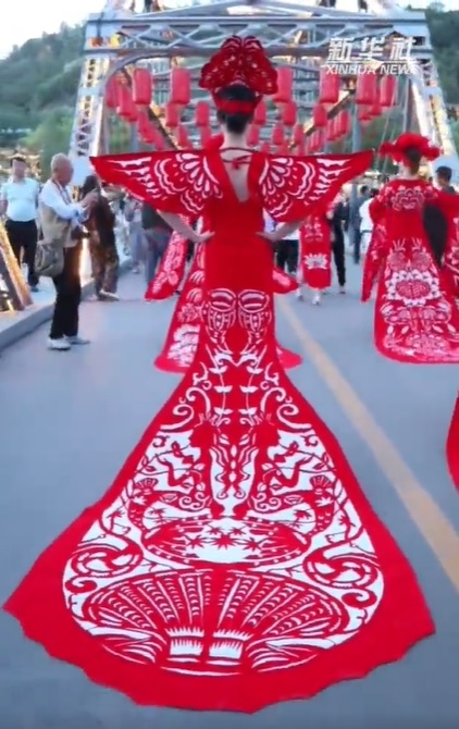 慶陽剪紙?jiān)从谏睢⒅v究情趣,是勞動(dòng)人民生產(chǎn)生活、情感氣質(zhì)、觀念習(xí)俗和文化傳承的結(jié)晶。著名民俗學(xué)家靳之林先生稱剪紙藝人是“真正的藝術(shù)家”。1986年,中央美術(shù)學(xué)院邀請(qǐng)鎮(zhèn)原縣民間美術(shù)大師祁秀梅赴北京進(jìn)行民間美術(shù)教學(xué)交流,向大學(xué)生演示民間剪紙。法國、日本、澳大利亞等國家的藝術(shù)家也多次專程到隴東考察民間剪紙藝術(shù)。慶陽剪紙已由鄉(xiāng)村婦女手中的小玩意,堂而皇之地步入了國家藝術(shù)殿堂——中國民間美術(shù)館,并在日、意、澳等國家展覽亮相。圖為身著慶陽剪紙服裝的模特們行走在蘭州中山橋上,驚艷了來往的游客。