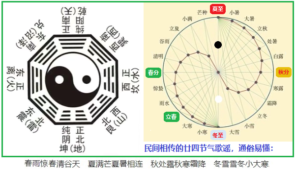 八卦是中華先民理性思維和高度智慧的結(jié)晶。華夏7000年前伏羲創(chuàng)制的八卦圖最初是用來分時(shí)紀(jì)年的,而在此基礎(chǔ)上發(fā)展起來的廿四節(jié)氣后來卻大放異彩。所謂“太極生兩儀,兩儀生四象,四象生八卦”的陰陽變化,其實(shí)指的就是四季輪替,它代表了事務(wù)孕育、發(fā)展、成熟和衰亡的自然規(guī)律,告訴世人“變化,才是永恒不變的規(guī)律”這一本質(zhì)!如果在八卦圖上繼續(xù)往下切分,就能很自然地從八卦圖上得到廿四節(jié)氣(見圖)。