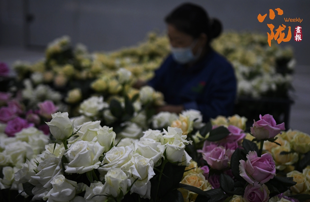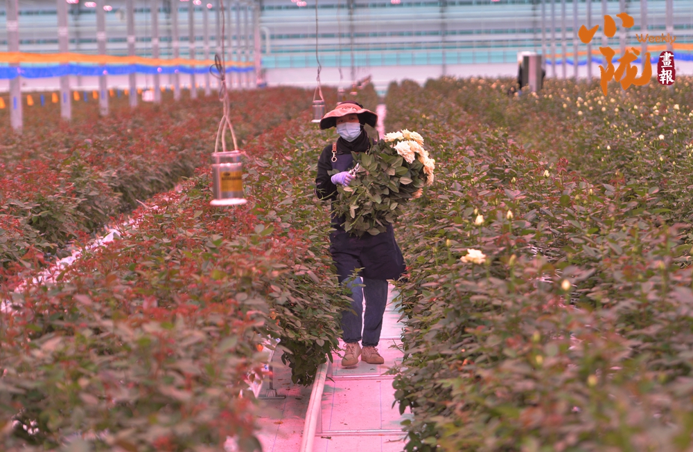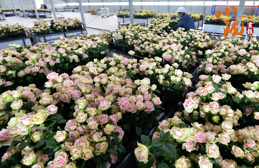 工作人員忙著采摘、分揀、包裝,一束束鮮切玫瑰從這里搭乘冷鏈物流,不僅暢銷國內(nèi),還遠(yuǎn)銷海外,成為“一帶一路”上一張靚麗的名片。