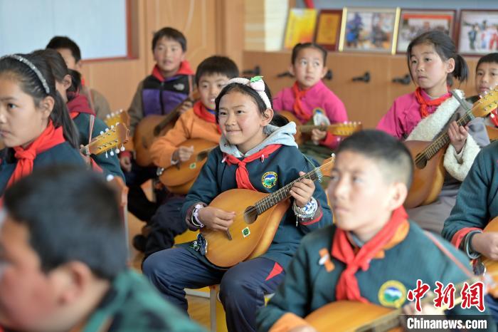 中新社記者近日探訪瑪曲縣寄宿制藏族小學(xué)彈唱社團(tuán)活動(dòng),未進(jìn)教室,已聽(tīng)到室內(nèi)傳出的歡快琴聲和笑聲。