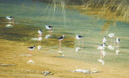 4月9日,一群黑翅長(zhǎng)腳鷸在定西湖水面飛行。進(jìn)入4月,候鳥(niǎo)陸續(xù)北遷,定西湖成了眾多鳥(niǎo)群遷徙途中的歇腳補(bǔ)給地。新定西·定西日?qǐng)?bào)記者 牛小棟 攝