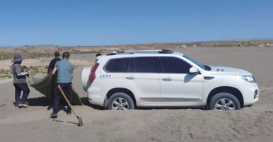 車子終于在陷入沙地3小時(shí)后脫離困境??疾靾F(tuán)在羊井子鄉(xiāng)用過午餐后返回酒泉。